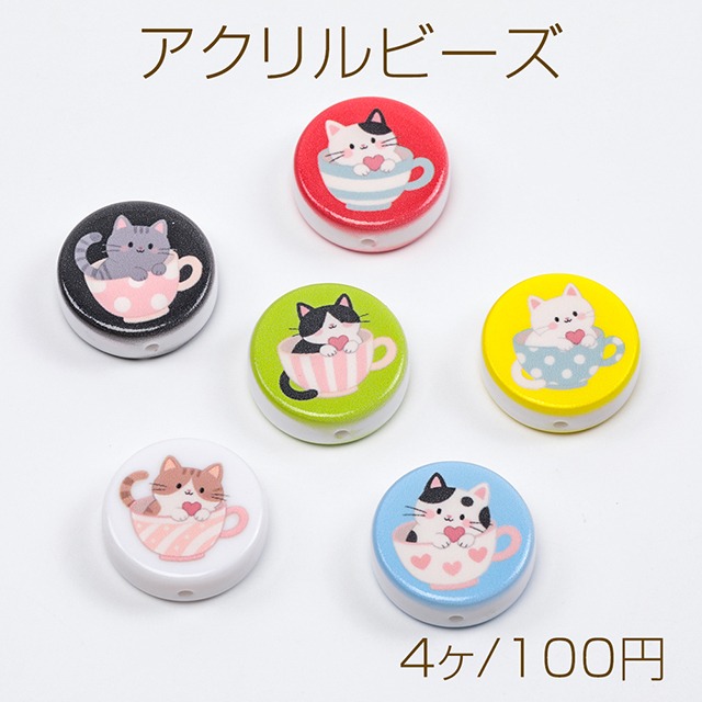 A3647 アクリルビーズ ネコ 猫 キャット ラウンド フラット コイン型 イラスト アニマルビーズ 動物ビーズ 約22mm(4ヶ)