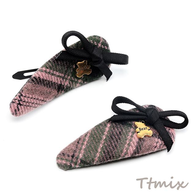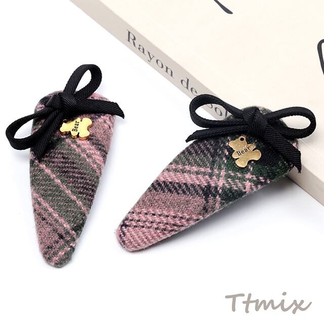 TH1007 ヘアクリップ 鉄製 チェック柄 リボン クマのチャーム付き 髪飾り 髪留め 約3×7.5cm(1ヶ) | Beads&parts BASE2号店