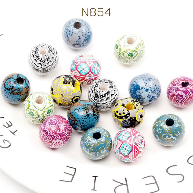 N854 ウッドビーズ ボタニカル柄 レトロ ミックス ※色・模様指定不可 約16mm(口径4mm)(10ヶ) | Beads&parts BASE2号店