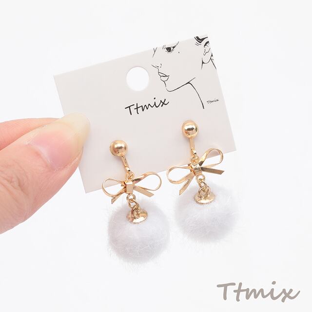 LS1121 デザインイヤリング リボン&白いポンポン ふわふわ 秋冬 可愛い ネジバネ式イヤリング ※訳ありサービス品 返品不可(1ペア) | Beads&parts BASE2号店