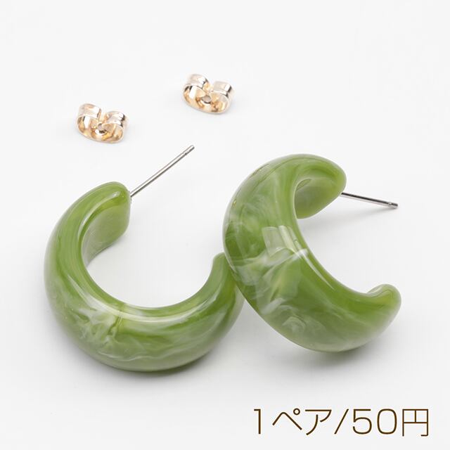 LS1187 デザインピアス C字 編みビーズ マーブルグリーン スタッドピアス 約11×26mm(1ペア)