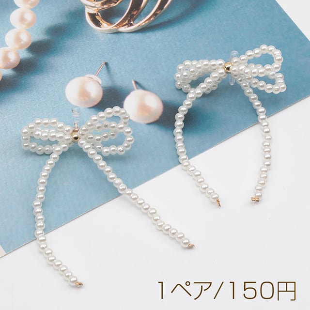 LS1188 デザインピアス ノンホールピアス パールリボン ABSパール 編みビーズ ポスト樹脂製 ピアス穴不要(1ペア)