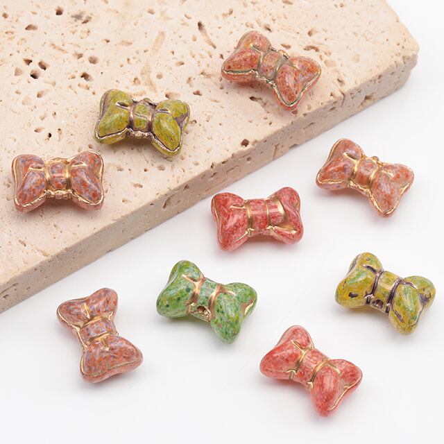 B1564 チェコ調ガラスビーズ リボン 立体 チェコガラス風 アンティーク風 カラーランダム 約10×14mm(10ヶ)