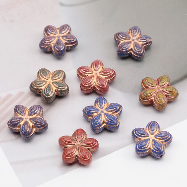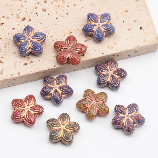 B1599 チェコ調ガラスビーズ 五弁花 お花 花形 フラワービーズ チェコガラス風 アンティーク風 カラーランダム 約16mm(8ヶ)