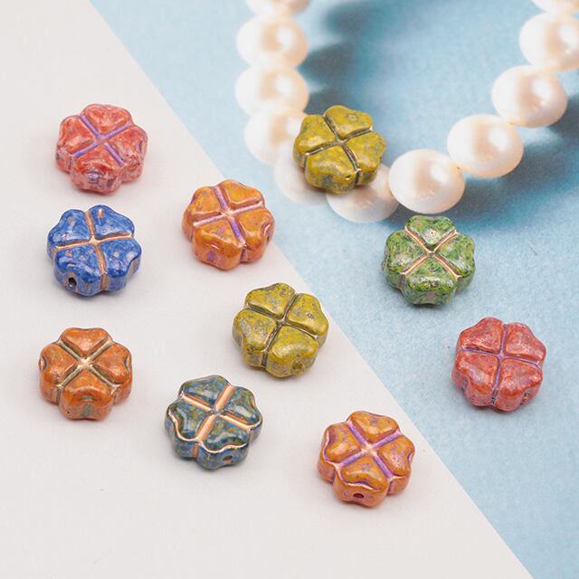 B1602 チェコ調ガラスビーズ 四つ葉 クローバー フラワービーズ チェコガラス風 アンティーク風 カラーランダム 約10mm(10ヶ)