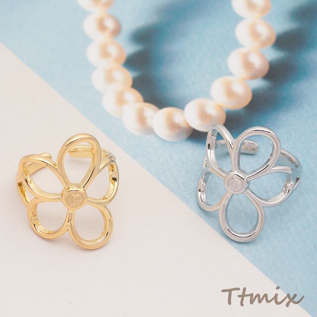 M16045 デザインリング 透かしフラワー 指輪 メタル オープンリング 15号内径約17.7mm(幅約26mm)(1ヶ)