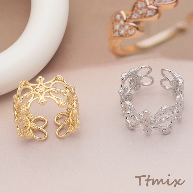 M16057 デザインリング 透かし模様 クロス フラワー 指輪 メタル オープンリング 15号内径約17.7mm(幅約13mm)(1ヶ)