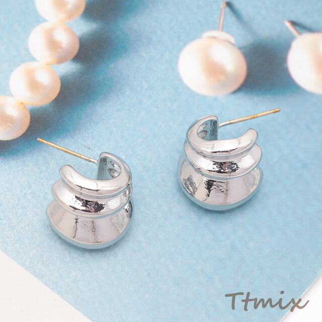 M16090 デザインピアス 3層C字 太め スタッドピアス メタルピアス 約14×15mm(1ペア)