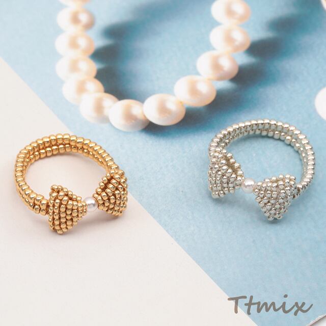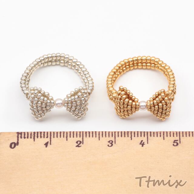 B1651 デザインリング リボン 編みビーズ ABSパール 15号内径約17.7mm(幅約11mm)(1ヶ)