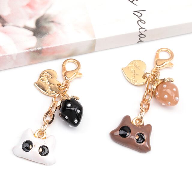 M16098 カニカン付きチャーム 苺 イチゴ 猫 ねこ顔 スマホチャーム マスクチャーム ストラップ キーホルダー(1ヶ)
