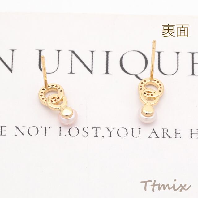 TE1158 デザインピアス ダブルリング ラインストーン&ABSパール付き ゴールドカラー 銅製 スタッドピアス 約6×12mm(2ヶ)