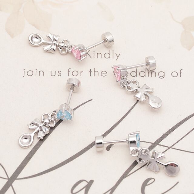 M16334 バーベルピアス ストーン&揺れるチャーム ステンレス製 メッキ加工 デザインピアス 約5×5mm6×13mm( 1ペア)