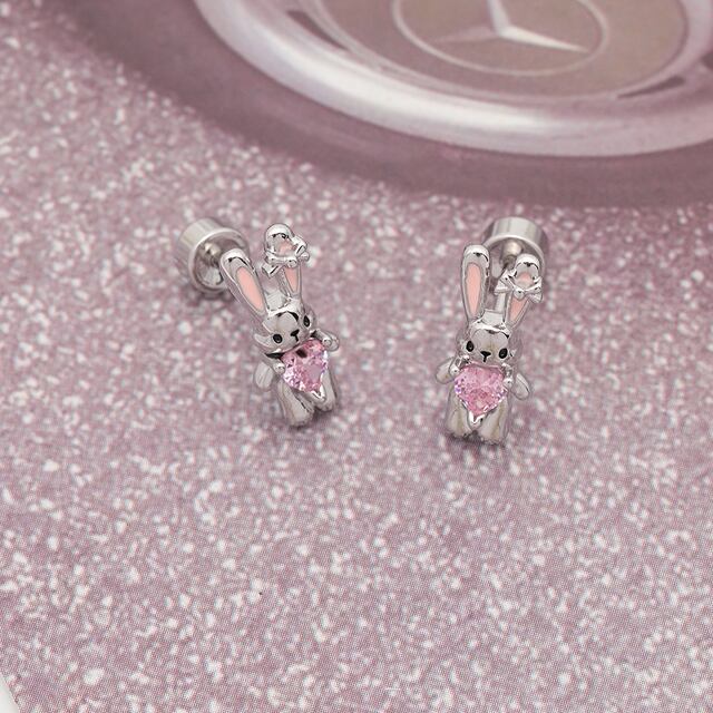 M16336 バーベルピアス リボン/うさぎ ピンクストーン付き ステンレス製 メッキ加工 デザインピアス 約8×10mm( 1ペア)