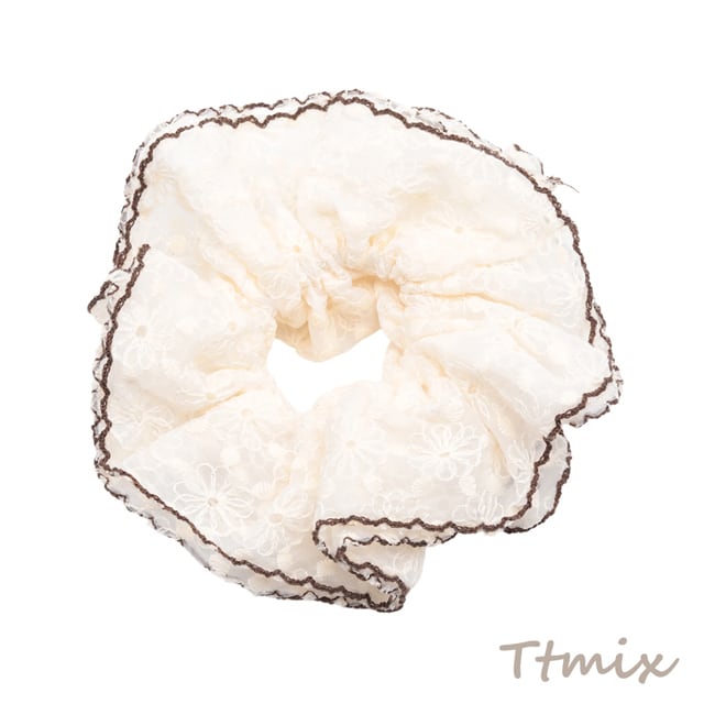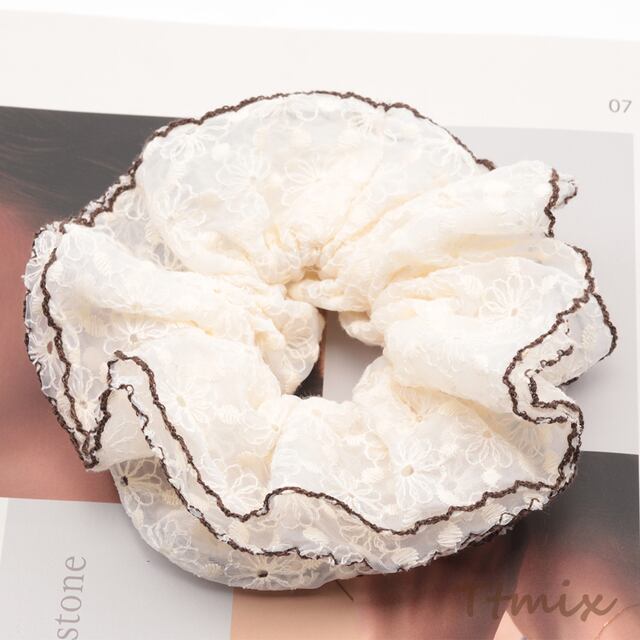 TH1539 シュシュ オフホワイト&ブラウン 透け感 レース フラワーモチーフ 髪飾り 髪留め ヘアゴム ヘアアクセサリー(1ヶ)