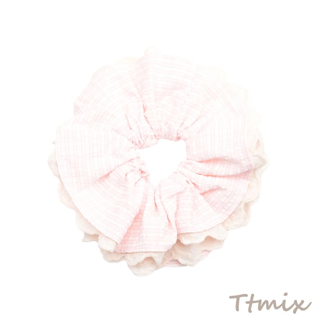 TH1541 シュシュ オフホワイト&ピンク チェック柄 フラワーレース 髪飾り 髪留め ヘアゴム ヘアアクセサリー(1ヶ)