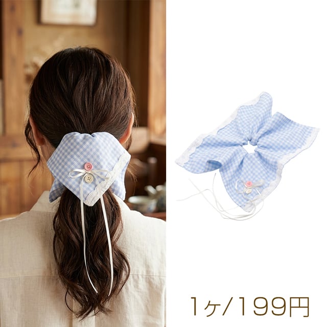 TH1543 シュシュ ブルー カントリー風 スカーフリボン チェック模様 髪飾り 髪留め ヘアゴム ヘアアクセサリー(1ヶ)