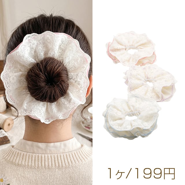 TH1548 シュシュ レースフリル×ドット柄 髪飾り 髪留め ヘアゴム ヘアアクセサリー(1ヶ)