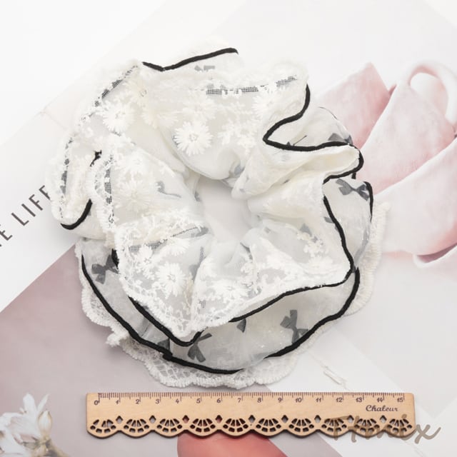 TH1551 シュシュ リボン柄 2層レース フラワーモチーフ パール付き 髪飾り 髪留め ヘアゴム ヘアアクセサリー(1ヶ)