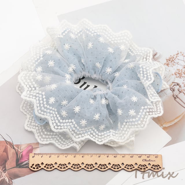 TH1552 シュシュ チェック&ドット柄 2層レース フラワーモチーフ パール付き 髪飾り 髪留め ヘアゴム ヘアアクセサリー(1ヶ)