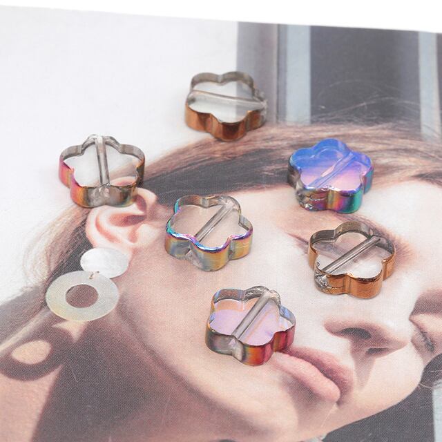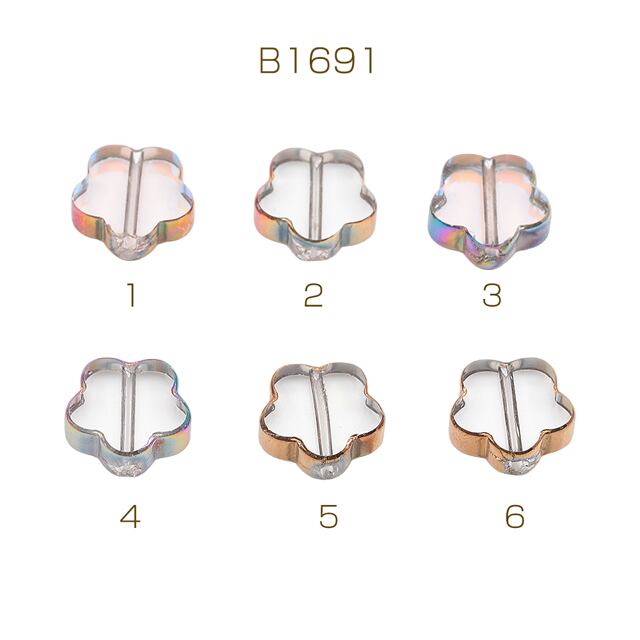 B1691 ガラスビーズ 五弁花 クリア オーロラメッキの縁 研磨加工 フラットビーズ 約12mm(4ヶ)