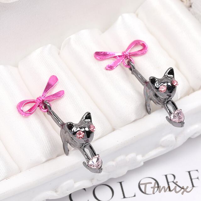 TE1004 デザインピアス リボン&ハート&猫のピアス 13×37mm ピンク×ブラック(1ペア)