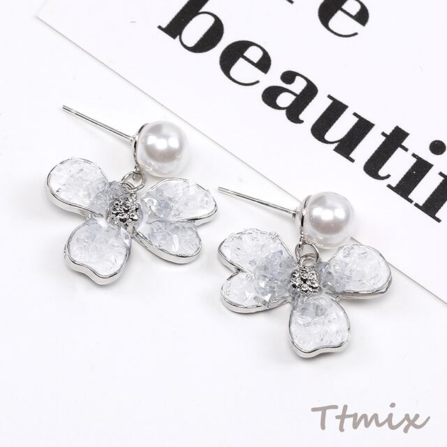 TE1040 デザインピアス フラワー&パールのピアス 24×25mm(1ペア)