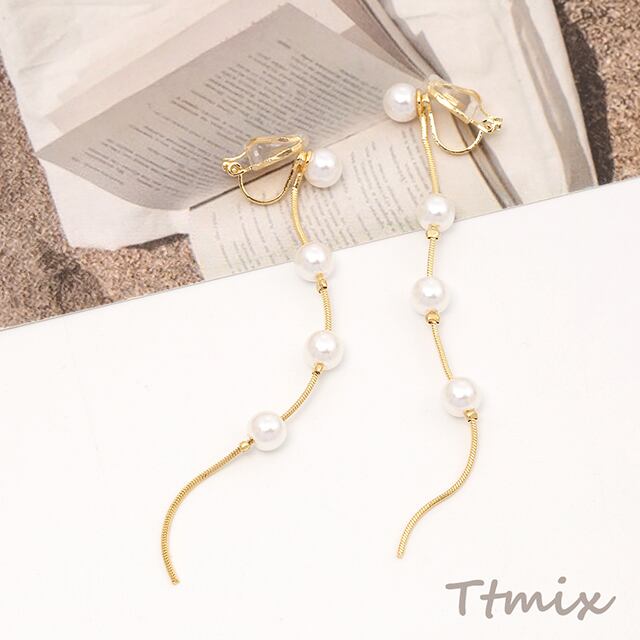 TE1100 クリップ式イヤリング パール チェーンタッセル 80mm(1ペア)