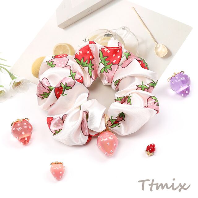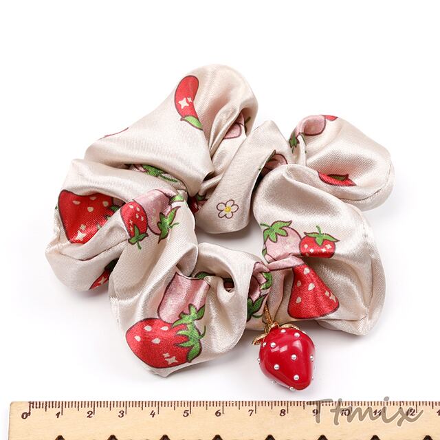 TH1329 いちご柄シュシュ ヘアアクセサリー いちごモチーフ 苺柄プリント いちごチャーム付き