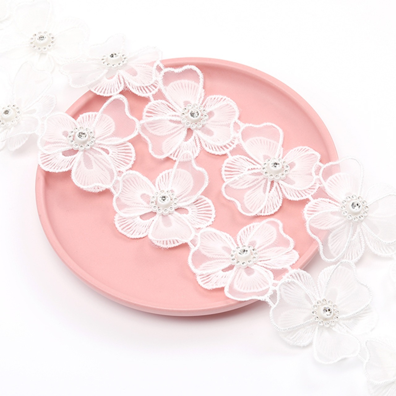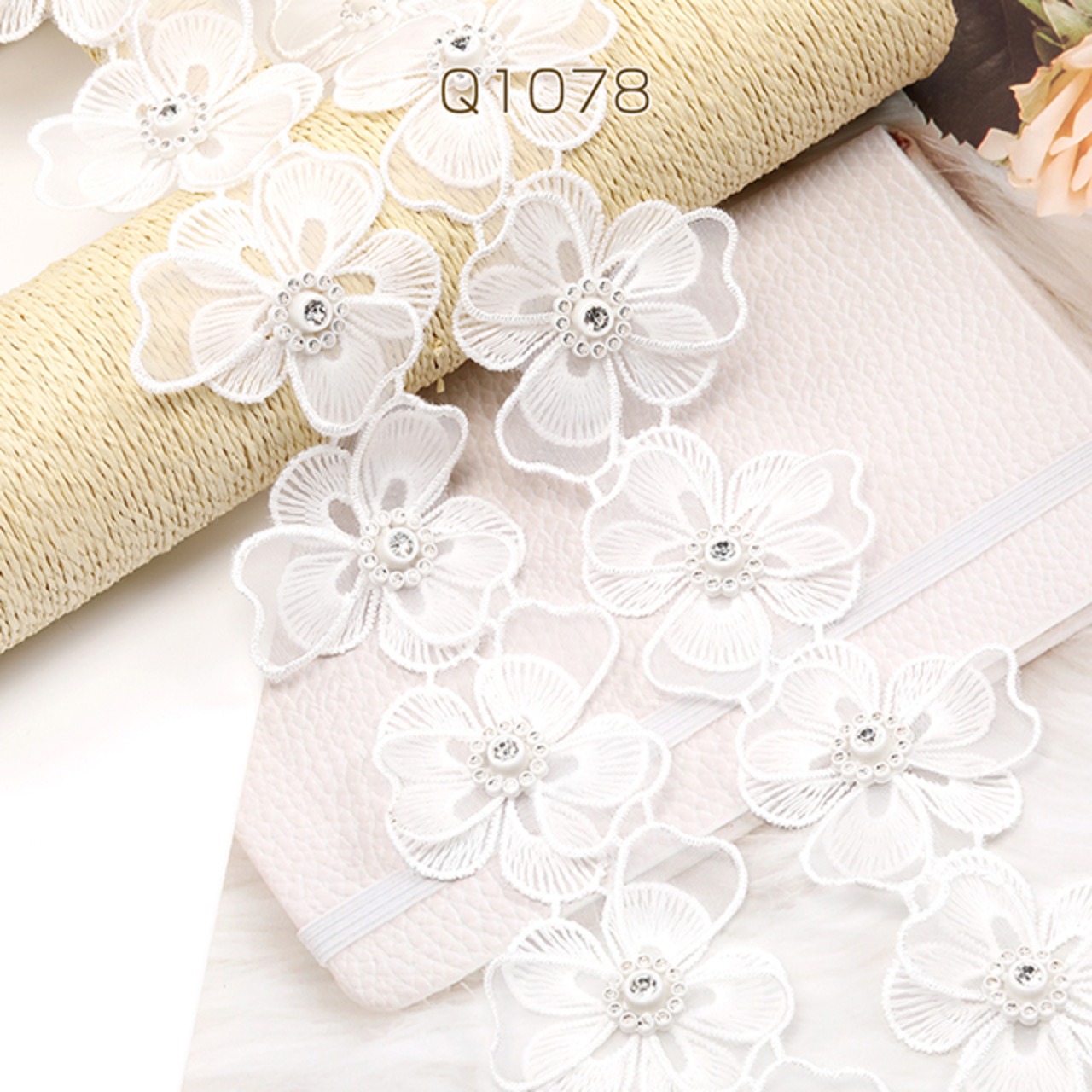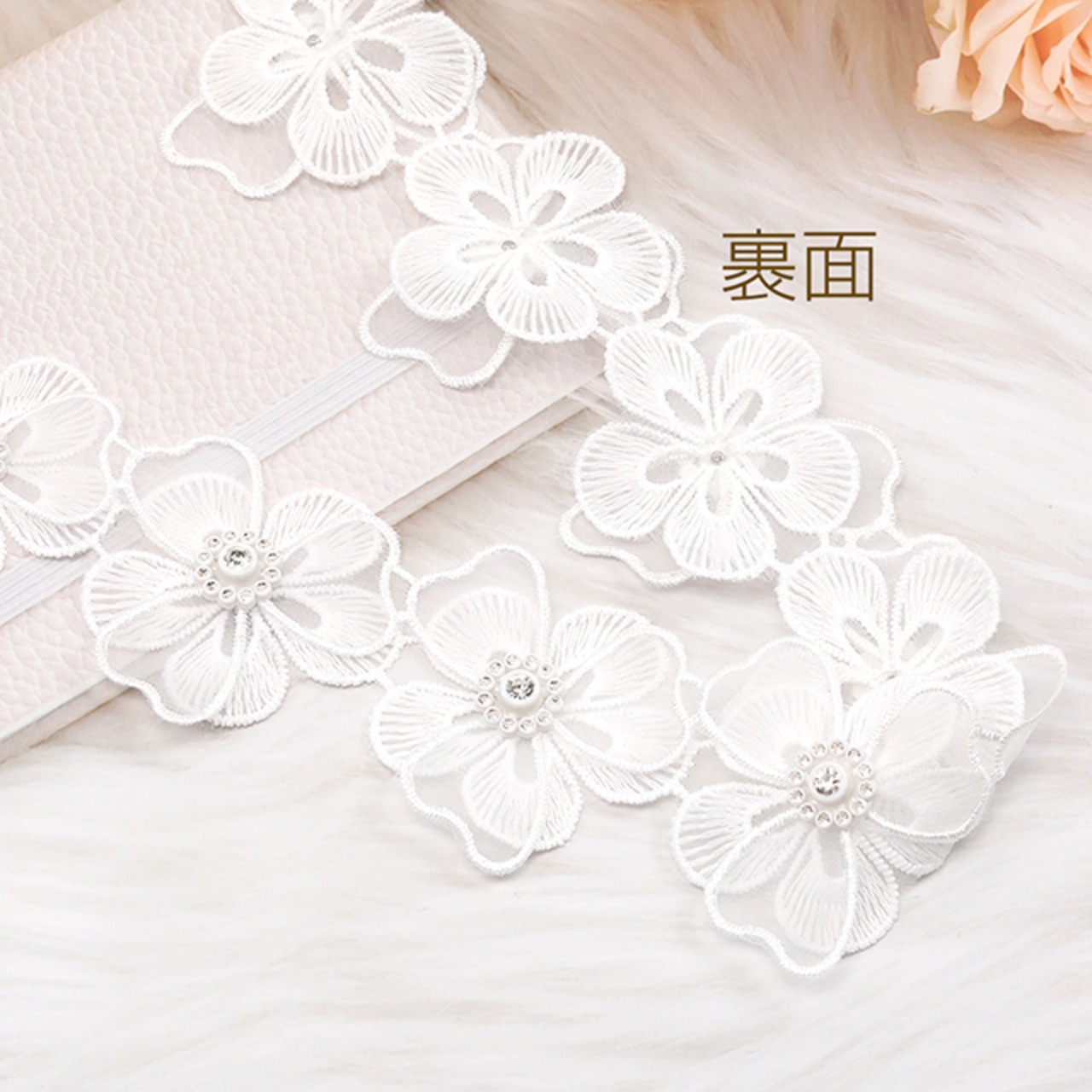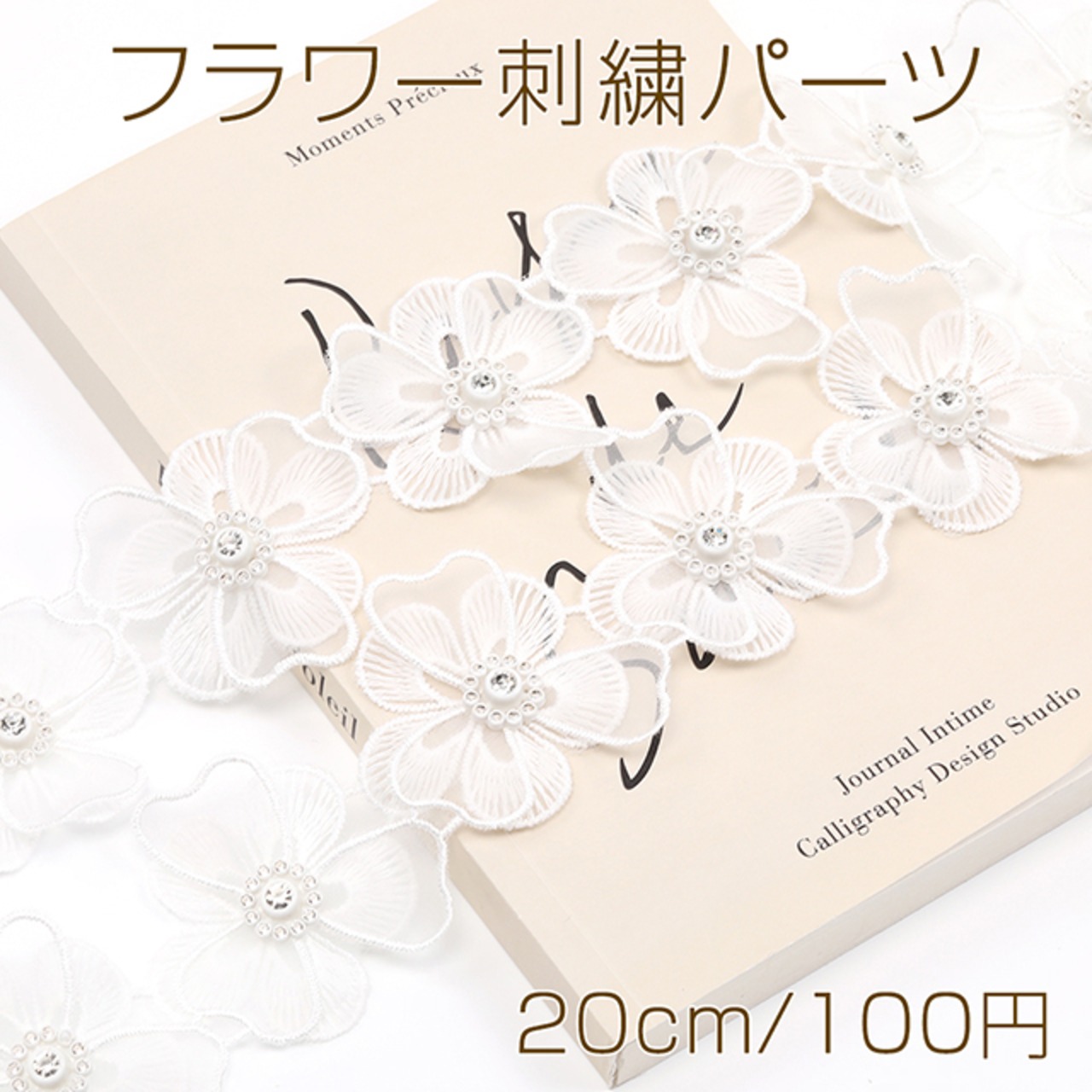 Q1078 フラワー刺繍パーツ フラワーモチーフ ラインストーン装飾 レース素材 花刺繍 幅5.5cm(20cm)