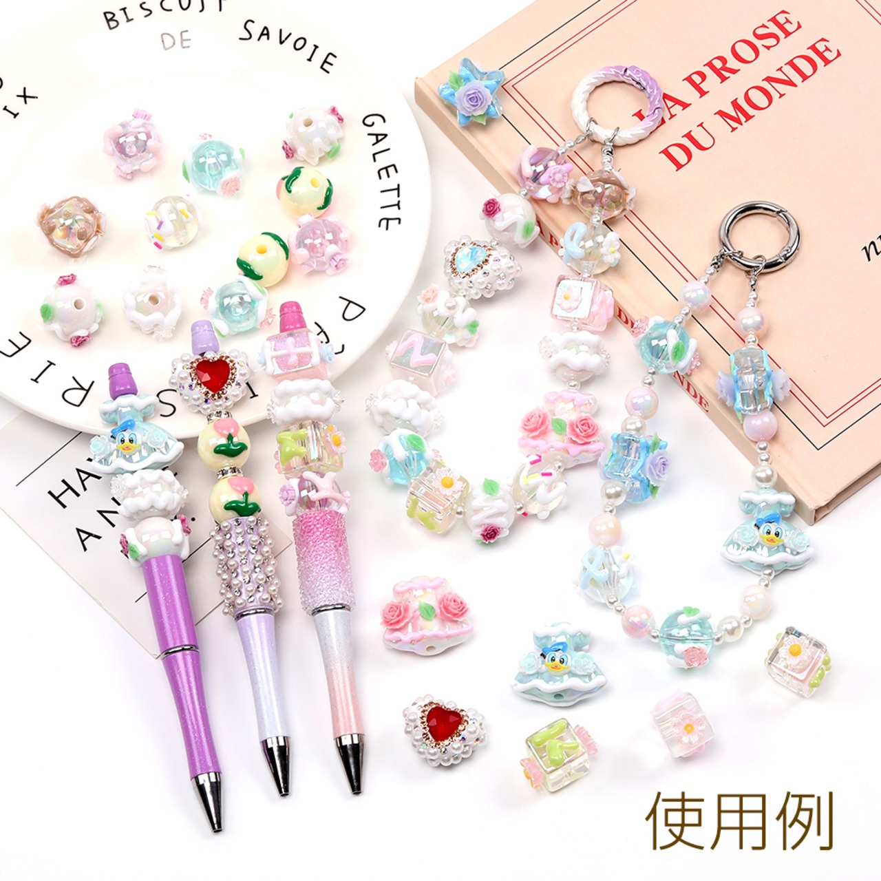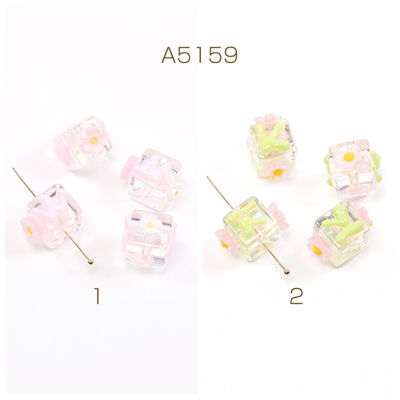 A5159 アクリルキューブビーズ 手描きアクリルビーズ キューブ型 スクエア型 通し穴あり 縦穴 フラワー装飾 花装飾 フラワー付き 花付き 14×14mm