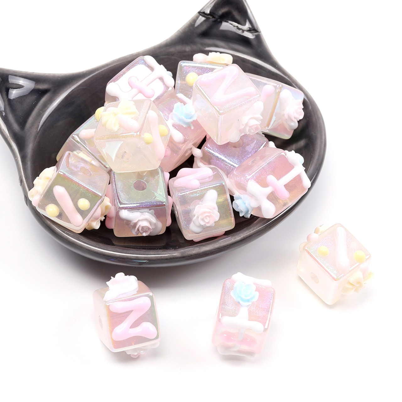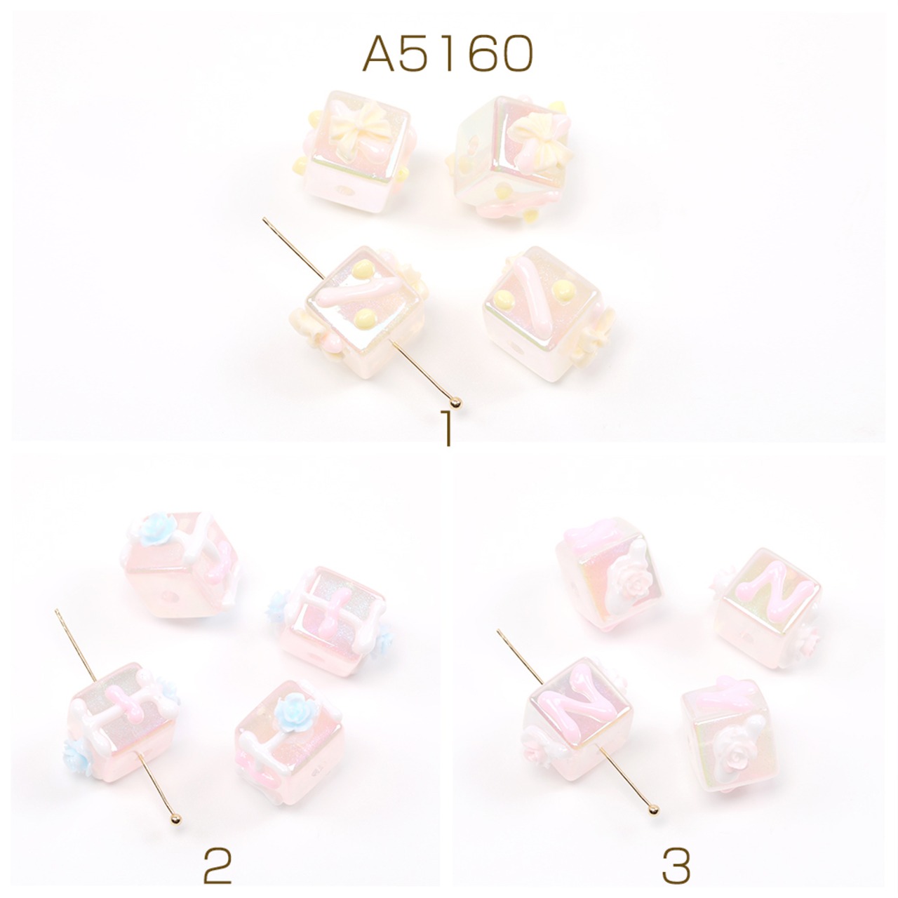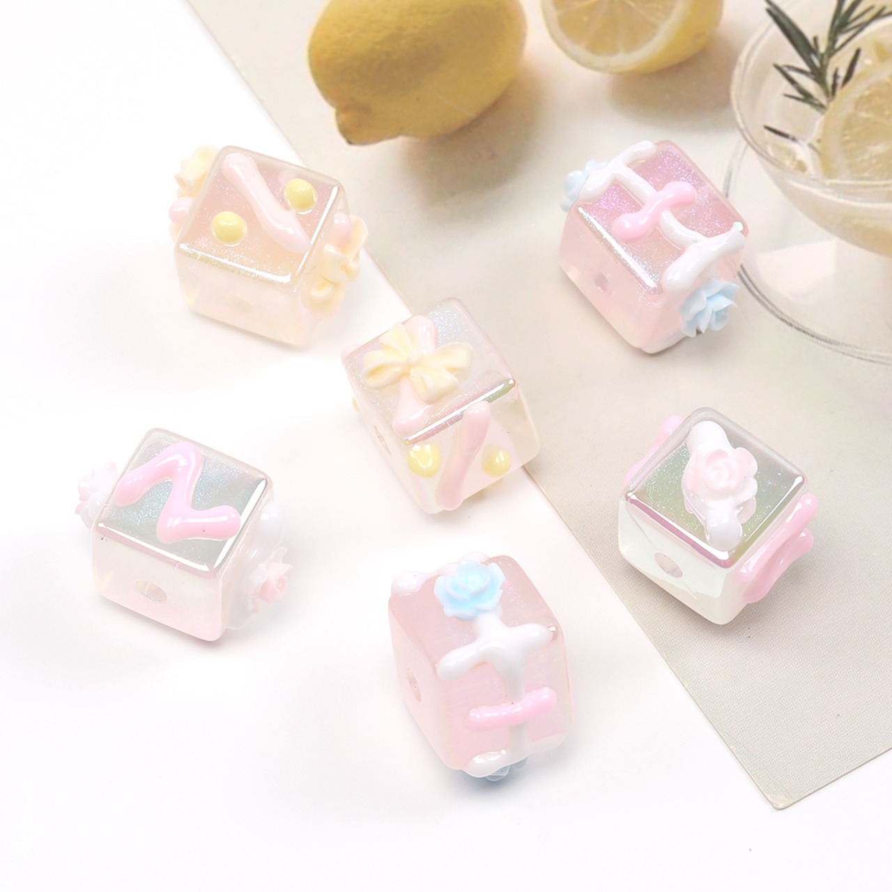 A5160 アクリルキューブビーズ 手描きアクリルビーズ キューブ型 スクエア型 通し穴あり 縦穴 リボン付き フラワー装飾 花装飾 フラワー付き 花付き 14×14mm