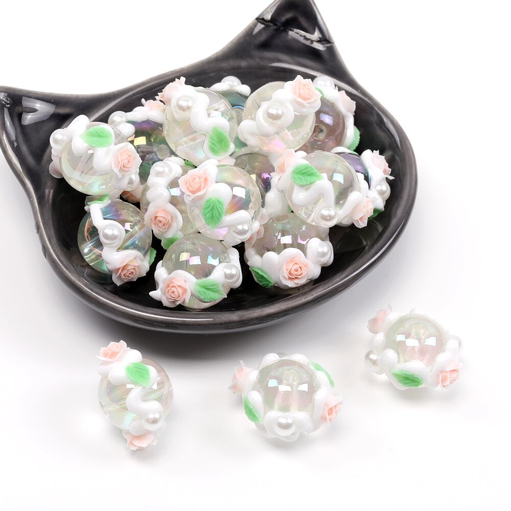 A5166 アクリル丸玉ビーズ 手描きアクリルビーズ 丸玉 ラウンド 円形 丸型 通し穴あり 縦穴 フラワー装飾 花装飾 フラワー付き 花付き 16mm(4ヶ)
