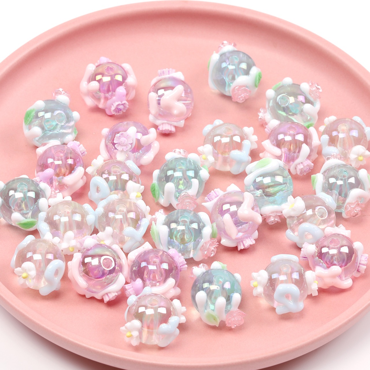 A5167 アクリル丸玉ビーズ 手描きアクリルビーズ 丸玉 ラウンド 円形 丸型 通し穴あり 縦穴 フラワー装飾 花装飾 フラワー付き 花付き 16mm