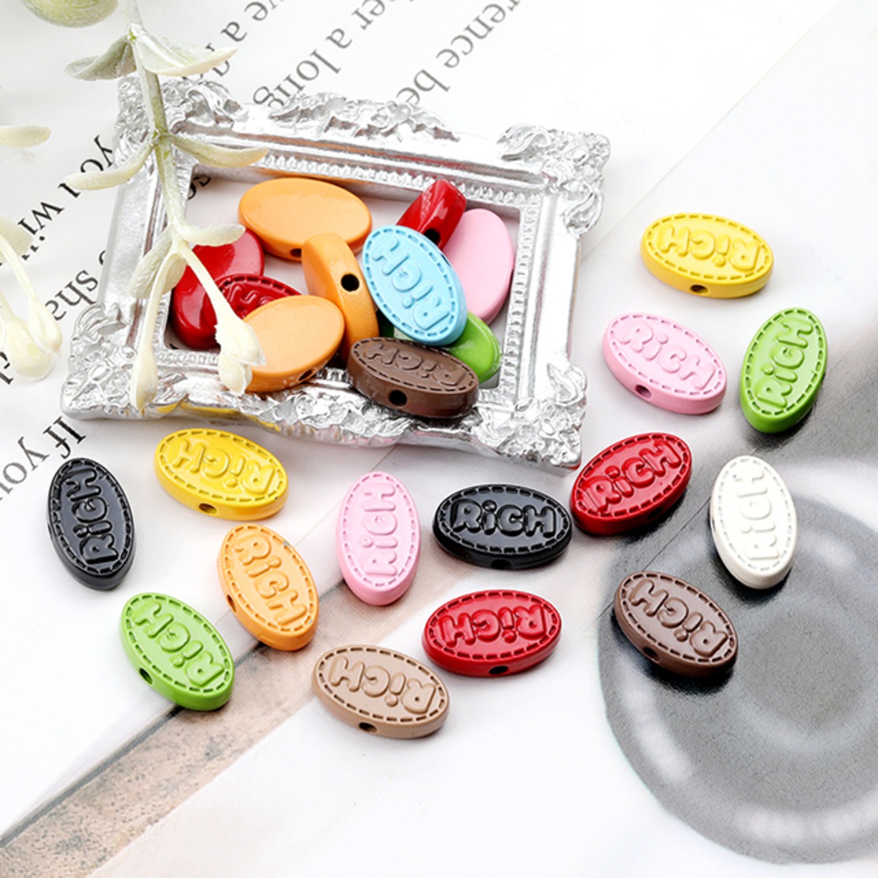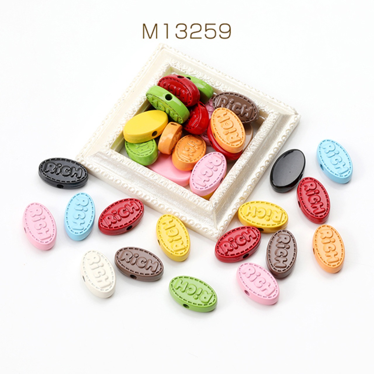 M13259 メタルオーバル型ビーズ メタルビーズ 塗装 オーバル 楕円形 刻印 通し穴あり ミックスカラー 8×13mm(6ヶ)