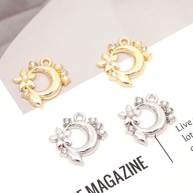 M13773 花と月チャーム フラワーとムーンチャーム メタルチャーム パールとラインストーン付き 1カン付き 約17×18mm(4ヶ) | Beads&parts BASE2号店