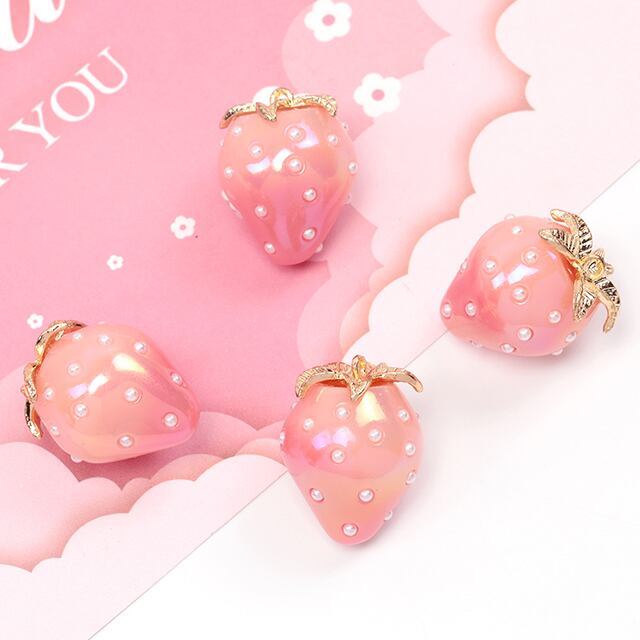 A536 いちごチャーム 樹脂製 イチゴチャーム フルーツチャーム 表面パール付き ピンクカラー 約18×23mm(2ケ) | Beads&parts BASE2号店