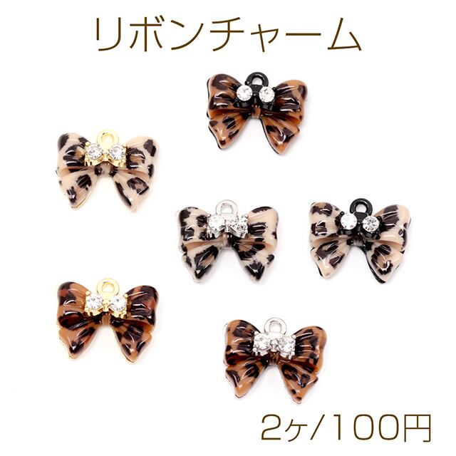 M14191 リボンチャーム ストーン付きりぼんチャーム レオパード ヒョウ柄チャーム 1カン付き 全6色 約14×17mm (2ヶ)