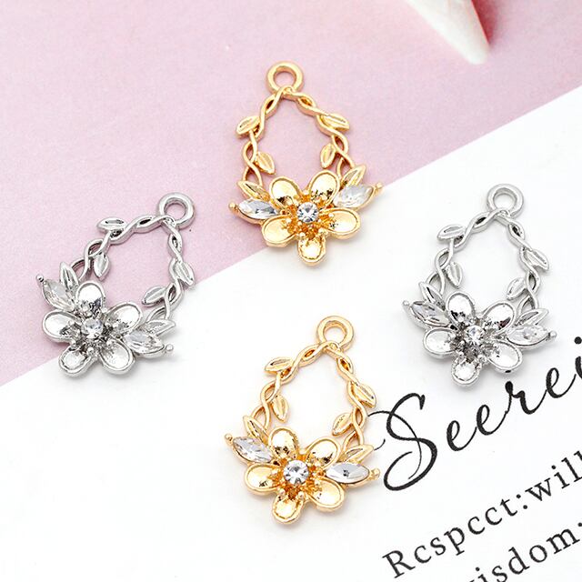 M3000 メタルチャーム フラワー ガラスストーン付き パール付き 合金製 約15×22mm(4ヶ)